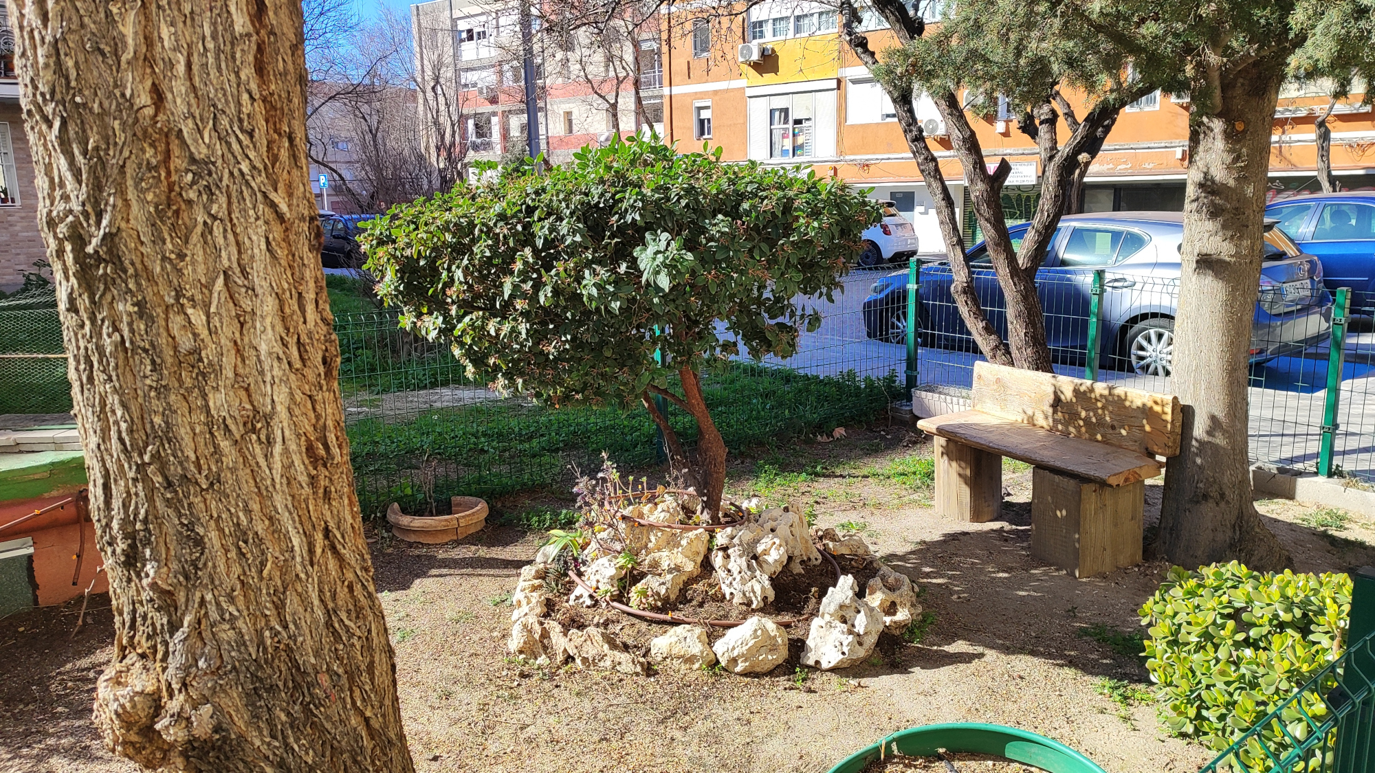 Por la valla pensamos que el jardín pertenecía a la comunidad de vecinos y que sería el portero el jardinero en la sombra. Así que entramos en el portal. Allí estaba Benito, tranquilo, con su uniforme de trabajo. Le preguntamos si era él su cuidador. Con serenidad y sin desconfianza nos contestó que sí. Le felicitamos y le pedimos si podía salir a contarnos su jardín.
